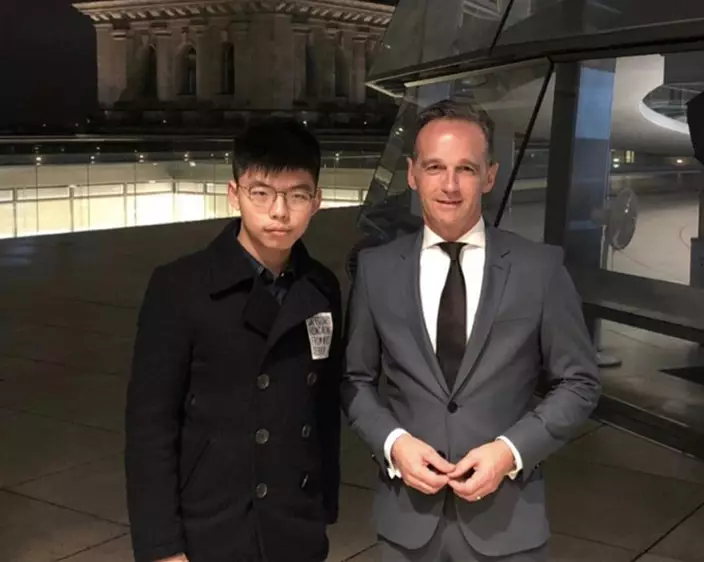 德國外長馬斯之前接受電視採訪時,主持人展示他去年和黃之鋒合照提問:德國是否會採取黃之鋒提出的對中國製裁主張,以應對香港不斷惡化的政治形勢?