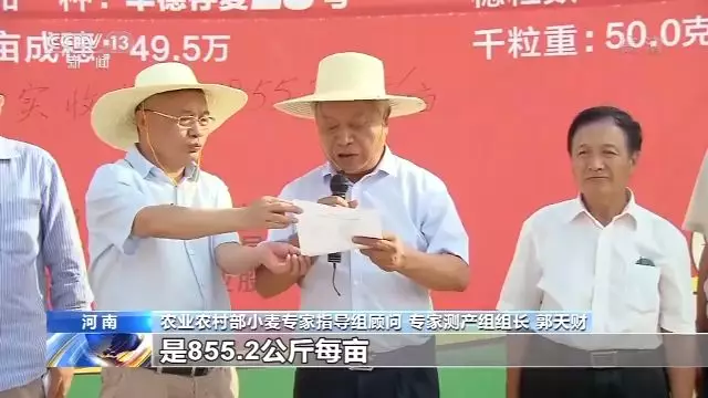 農業農村部小麥專家指導組顧問 專家測產組組長 郭天財:我們實收這三個點的平均畝產是855.2公斤每畝,刷新了黃淮冬麥區(千畝方)單產的最高紀錄。