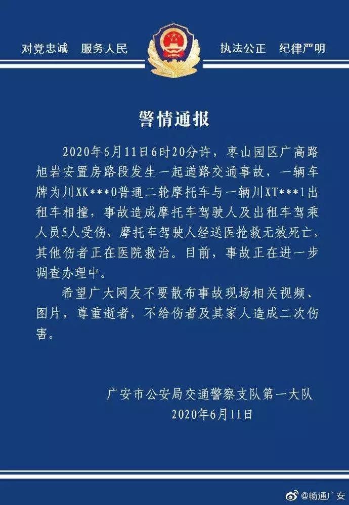 6月11日,四川廣安市公安局交通警察支隊官方微博發佈通報,2020年6月11日6時20分許,棗山園區廣高路旭岩安置房路段發生一起道路交通事故,一輛車牌為川XK**0普通二輪摩托車與一輛川XT***1計程車相撞,事故造成摩托車駕駛人及計程車駕乘人員5人受傷,摩托車駕駛人經送醫搶救無效死亡,其他傷者正在醫院救治。