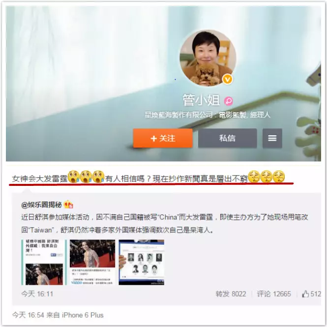 事件引起網民熱議,而舒淇經理人管小姐在微博否認新聞:「女神會大發雷霆,有人相信嗎?現在炒作新聞真是層出不窮」。她之後又轉發一條舒淇等人在電影首映式上的photo call環節全程,寫道:「我深深相信大家眼睛是雪亮的。」