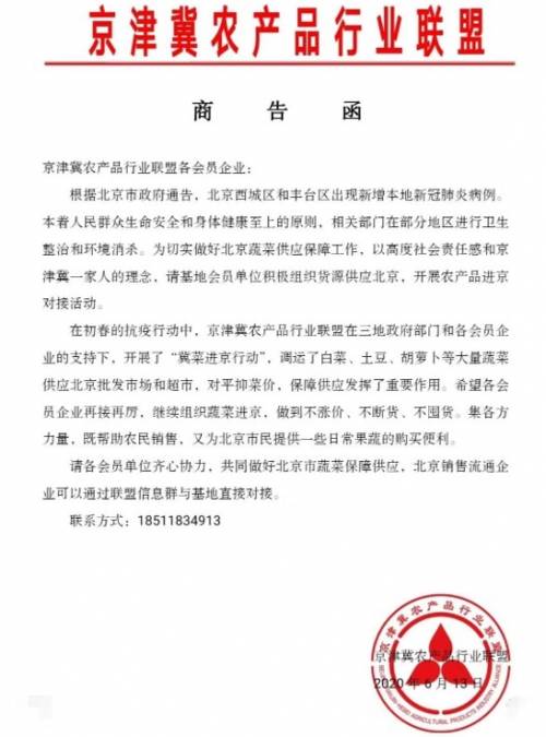 京津冀農產品行業聯盟由北京、天津、河北三地農業部門聯合成立,會員單位達到800多家,旨在推動三地農產品的產銷對接。6月13日,該聯盟發佈商告函,號召會員企業「組織蔬菜進京,做到不漲價、不斷貨、不囤貨。集各方力量,既幫助農民銷售,又為北京市民提供一些日常果蔬的購買便利」。
