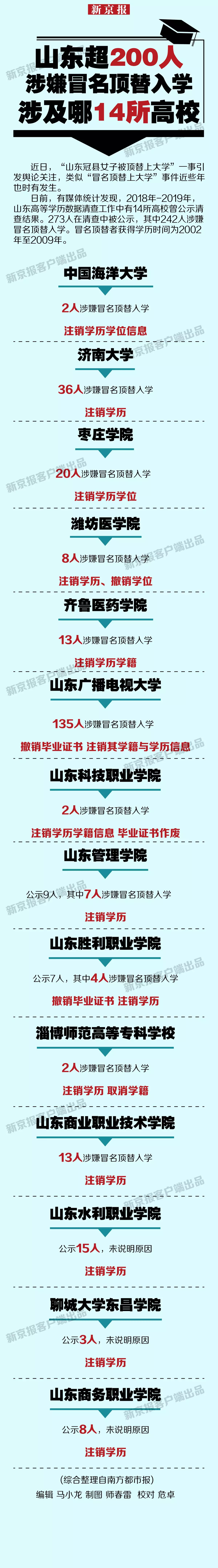 新京報梳理髮現,涉事14所高校中,不乏知名高校,如中國海洋大學,有2人涉嫌冒名頂替入學。此外,人數最多的是山東廣播電視大學,有135人被公示並註銷學歷信息。