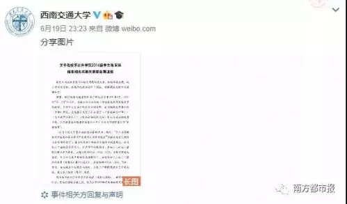 昨日23點23分,@西南交通大學 針對此事發出處理結果通報。