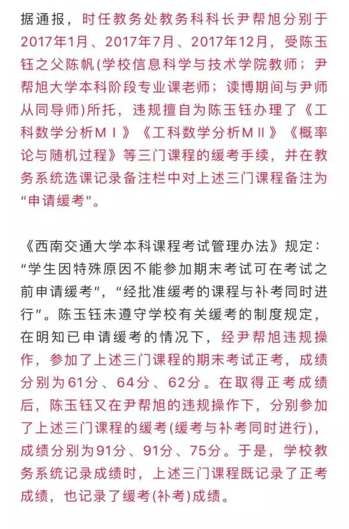 根據《西南交通大學推薦優秀應屆本科畢業生免試攻讀碩士學位研究生工作細則》之規定,陳玉鈺《工科數學分析MI》《工科數學分析MⅡ》《概率論與隨機過程》三門課程本應按照61分、64分、62分參與推免成績計算,由於尹幫旭的擅自違規操作,導致該三門課程成績按照91分、91分、75分計入了推免成績。陳玉鈺《線性代數M》課程本應按照62分參與推免成績計算,同樣由於尹幫旭的擅自違規操作,導致該門課程被《線性代數B》替代,以82分計入了推免成績。