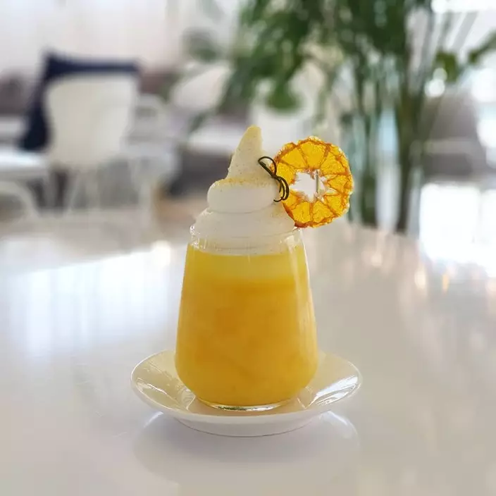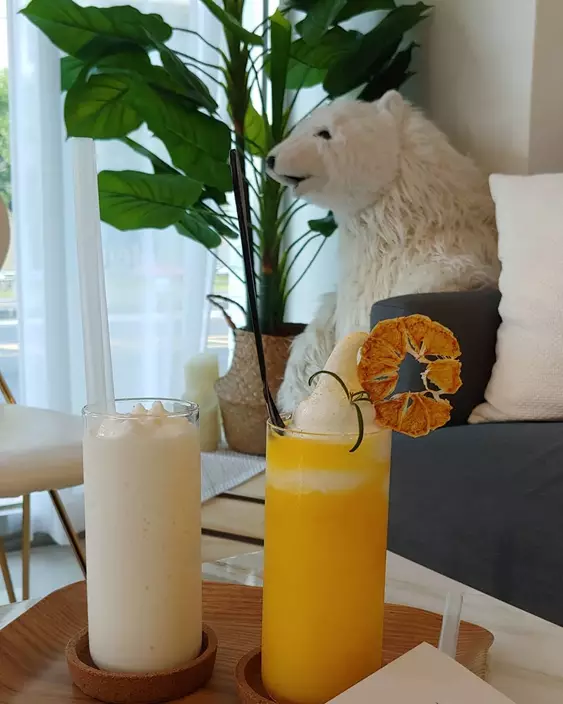 甜品上都用柑橘乾做裝飾,高顏值外觀吸引顧客拍照打卡。該店的招牌標誌是北極白熊,充滿極地清涼氣息。