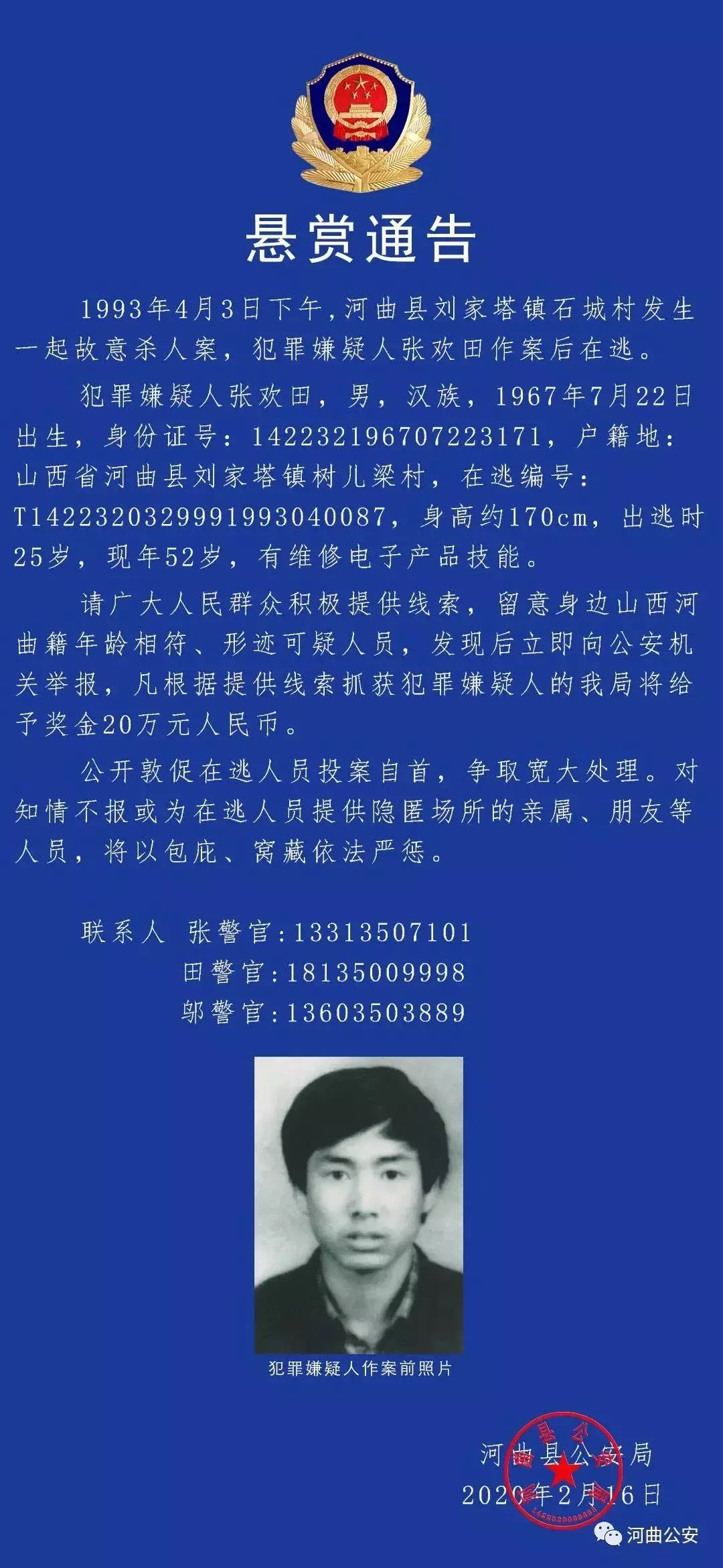 經過不懈追查,萬里追蹤,2020年6月19日晚,山西警方將潛逃27年的命案積案逃犯張某田(男,52歲,河曲縣劉家塔鎮人)抓獲。