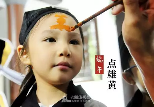 端午節這一天,古人有飲雄黃酒的習俗,古語曰「飲了雄黃酒,病魔都遠走。」然而,從現代科學的角度看,喝雄黃酒有損人的身體健康,危險性很大。許多地方有用雄黃酒在孩子額頭上書寫「王」字的習俗,這也表現出人們對虎的崇拜,一借雄黃以驅毒,二借猛虎以鎮邪,三則表達對孩子的祝福。