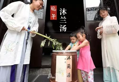 端午日沐浴蘭湯的習俗,歷史悠久,戰國時代已有明確記載。《大戴禮記》中說:「五月五日,蓄蘭為沐浴。」當時的蘭不是現在的蘭花,而是菊科的佩蘭,有香氣,可煎水沐浴。時至今日,在我國廣東、湖南、廣西等地,人們用艾、蒲、鳳仙、桃葉等煮成藥水洗浴,據說可以治皮膚病,去邪氣。