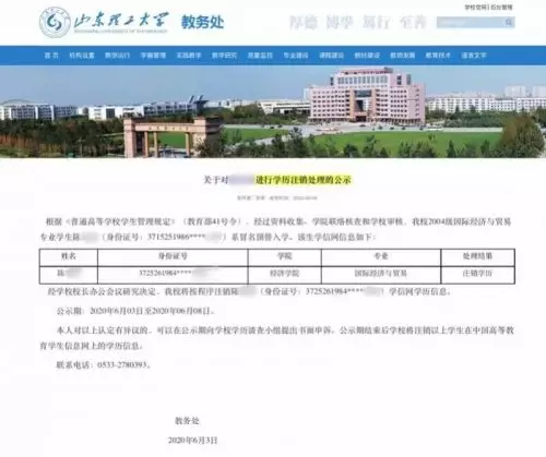 6月3日,山東理工大學發佈《關於對陳某某進行學歷註銷處理的公示》。公示稱,「經過資料收集、學院聯絡核查和學校審核,我校2004級國際經濟與貿易專業學生陳某某系冒名頂替入學,經學校校長辦公會議研究決定,我校將按程序註銷陳某某學信網學歷信息。」