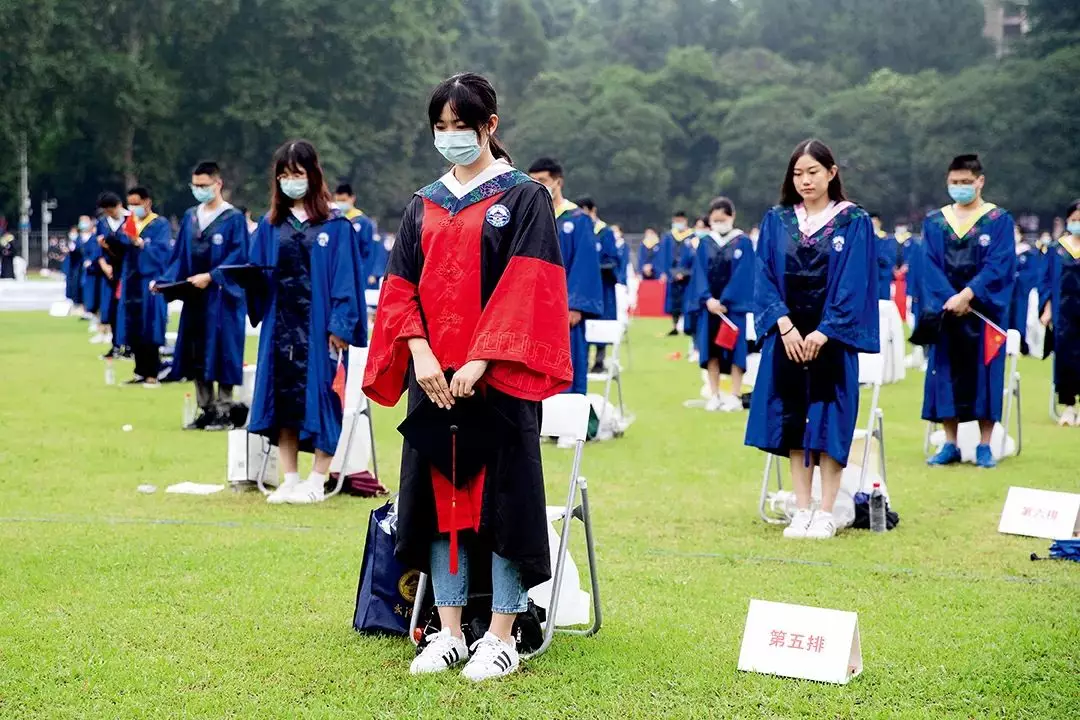 6月20日,武漢大學參加畢業典禮的師生為新冠肺炎犧牲烈士和逝世同胞默哀。當日,武漢大學舉行一場特殊畢業典禮,660名畢業生代表在現場撥穗正冠,未能到場的畢業生則通過觀看5G直播方式「雲」聚珞珈,共同見證自己的畢業盛典。圖/中新
