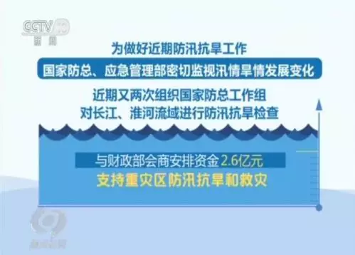 為做好近期防汛抗旱工作,國家防總、應急管理部密切監視汛情旱情發展變化,多次組織水利、氣象等部門聯合會商。近期又兩次組織國家防總工作組對長江、淮河流域進行防汛抗旱檢查,兩次啟動防汛防颱風Ⅳ級應急響應;派出3個應急工作組赴重災區協助和指導;與財政部會商安排資金2.6億元支持重災區防汛抗旱和救災。