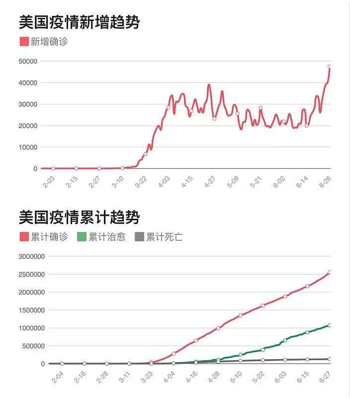 根據美國約翰斯·霍普金斯大學發佈的全球新冠肺炎數據,美國新冠肺炎累計確診病例數已達255萬例,累計死亡病例已達12.8萬例。美國昨日(6月26日)新增確診病例47341例,創下自疫情在美國暴發以來的歷史紀錄。美媒的一項分析發現,在過去兩周內,美國每日新增新冠肺炎確診病例數據上漲了約50%。由於檢測有限等因素,真實的數字可能更高。