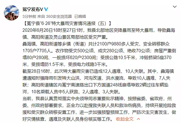 當前,我縣認真貫徹落實中央領導同志重要批示精神,按照省委、省政府,州委、州政府部署要求,正全力以赴搜救失聯人員和救治傷病員,持續開展搶險救援和受災群眾轉移安置工作,進一步加強預警預報工作,嚴防次生災害發生,做好災情核查,遇難及失聯人員身份核實等工作。