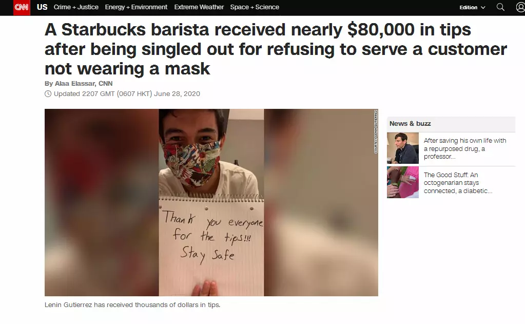美國有線電視新聞網(CNN)28日講述了這樣一個故事:加利福尼亞州南部城市聖迭戈的一名星巴克咖啡師,因拒絕為一位沒戴口罩的顧客提供服務被後者「揭發」上網,然而,令人意外的是,該名咖啡師不僅沒有引起網友的「討伐聲」,反而獲得眾多人為他籌集的近8萬美元(約56.6萬元人民幣)小費。