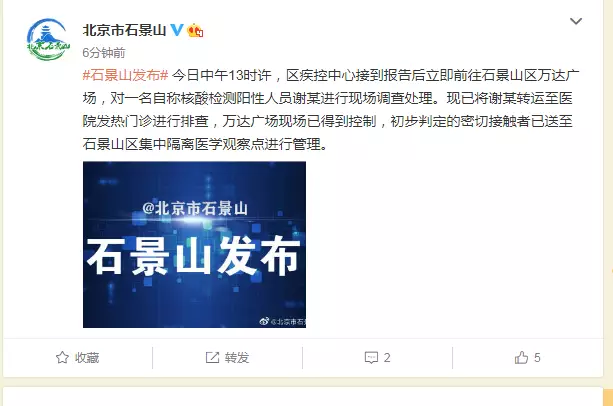 石景山衛健委介紹2日中午13時許,區疾控中心接到報告後立即前往石景山區萬達廣場,對一名自稱核酸檢測陽性人員謝某進行現場調查處理。現已將謝某轉運至醫院發熱門診進行排查,萬達廣場現場已得到控制,初步判定的密切接觸者已送至石景山區集中隔離醫學觀察點進行管理。
