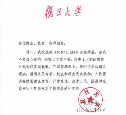 復旦大學官方昨天首次發聲明回應:「近日,我校視頻《To My Light》涉嫌抄襲,造成不良社會影響,損害了學校聲譽,傷害了大家的感情,對此我們真誠致歉。」聲明表示,校方將啟動調查,邀請專家、校友和師生代表參加,依據調查結果追究責任,嚴肅處理,改進工作。