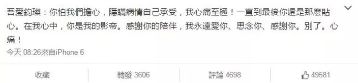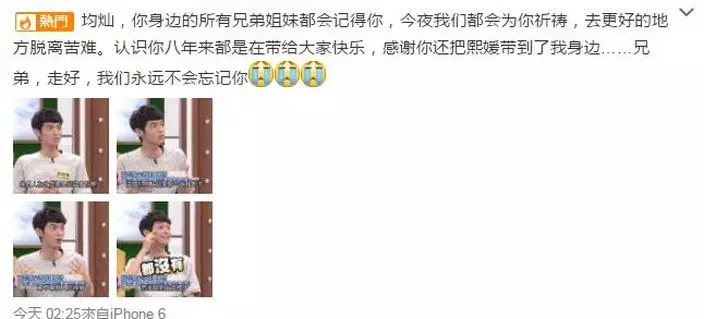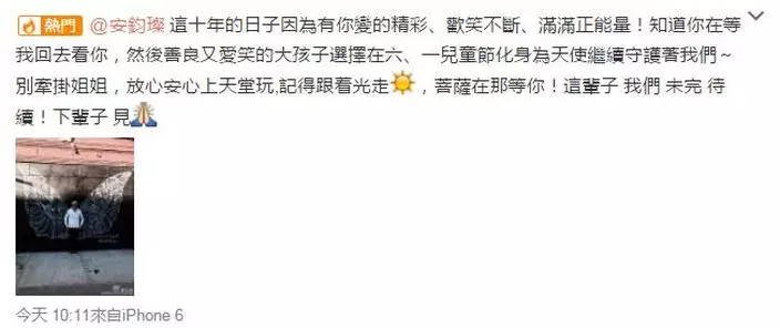 今早安以軒在微博悼念好友說:「…知道你在等我回去看你…」。鈞璨以前公開說過如果安以軒35歲未嫁他就娶她,但今年她正好35歲就離世。