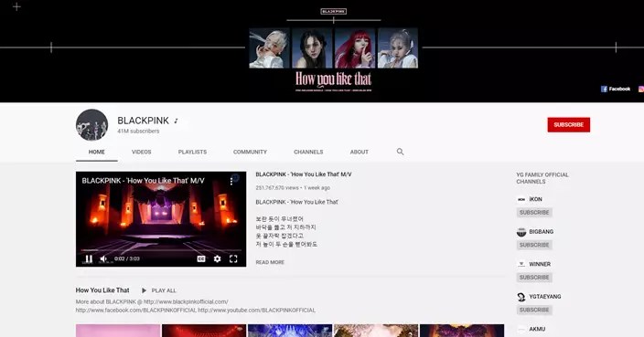 近期推出新曲《How You Like That》再刷新多項YouTube紀錄的BLACKPINK,她們頻道的訂閱人數有4070萬,總觀看量達99.72億,是韓國最多人訂閱的Youtube頻道。短短三年多時間,頻道就上載了超過200段BLACKPINK的影片,最高觀看次數的影片就是在較早前突破12億的《DDU-DU DDU-DU》MV。
