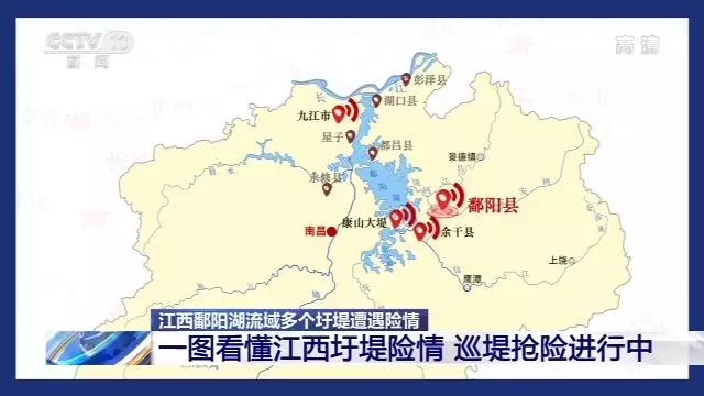 詳細了解一下鄱陽湖流域周圍的多個圩堤險情。可以看到,這張圖是鄱陽湖流域主要圩堤和河流的位置關係圖,有幾個關鍵的紅色標註地點,對應的就是圩堤搶險的關鍵點。首先是位於江西鄱陽縣的中洲圩,這裏的堤壩在9日晚上發生潰口,目前正在封堵。