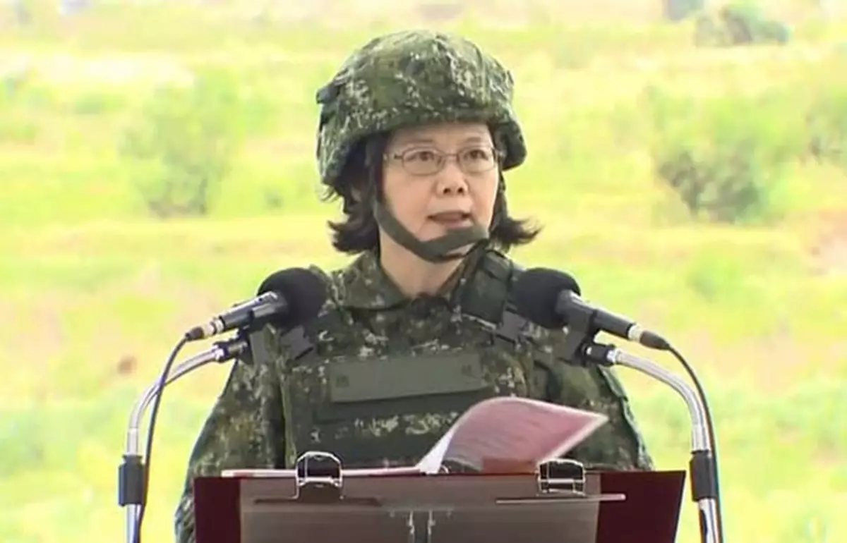 蔡英文穿上迷彩軍服到場視察。(網上圖片)