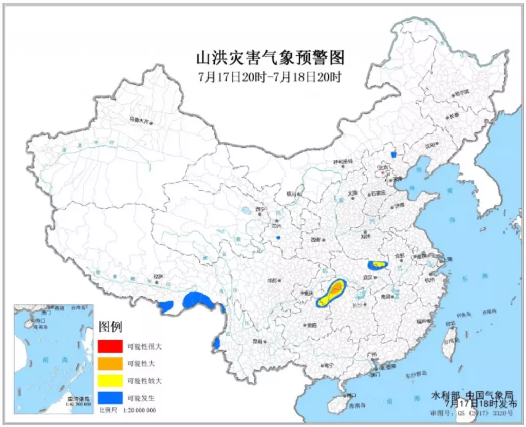 預計17日20時至18日20時,河南南部、湖北西南部和東北部、湖南西北部、重慶東南部、貴州東北部等地部分地區發生山洪災害可能性較大(黃色預警)。其中,湖北西南部、湖南西北部局地發生山洪災害可能性大(橙色預警)。