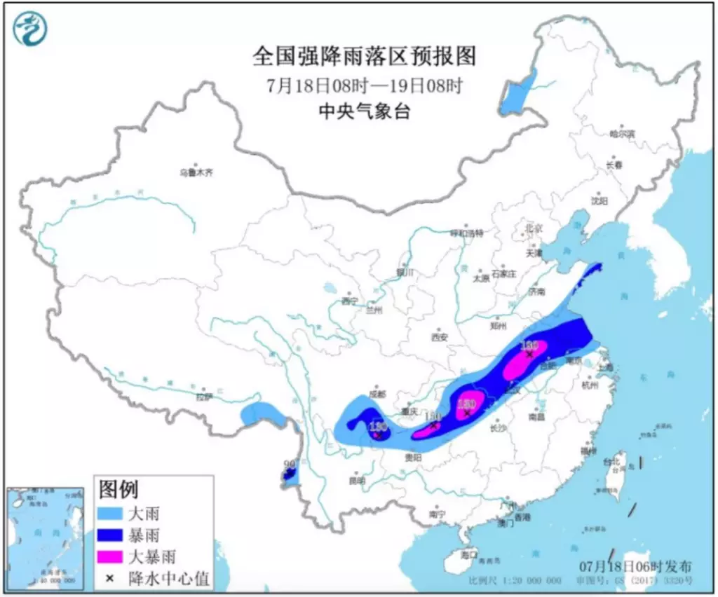 預計18日8時至19日8時,黃淮東部和南部、江淮、江漢南部和東部、湖南北部、西南地區東部、雲南北部等地的部分地區有大到暴雨。其中,安徽中北部、河南東南部、湖北東部和西南部、湖南西北部以及貴州中北部和雲南東北部等地的部分地區有大暴雨。