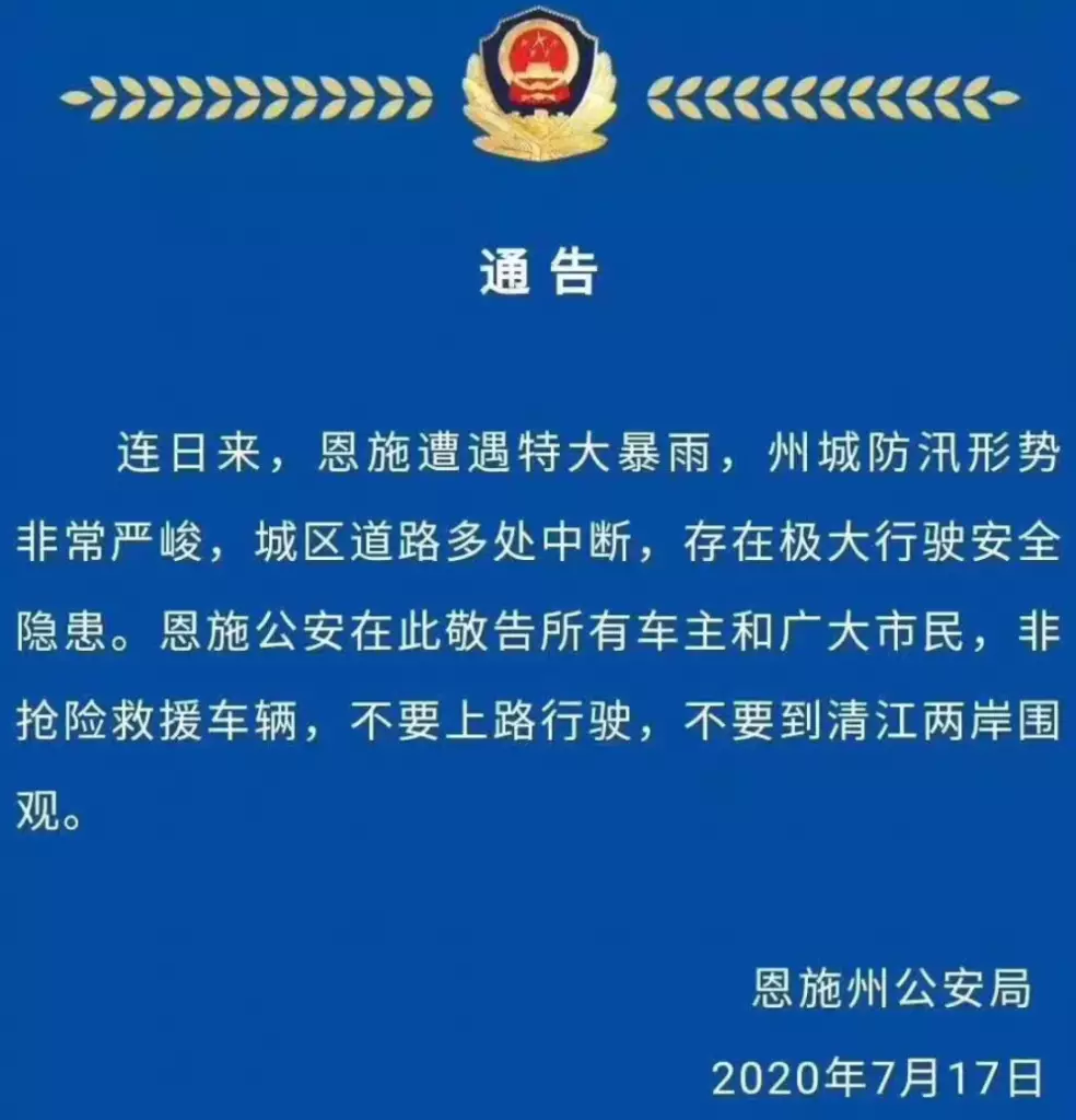 恩施公安發佈通告稱,非搶險救援車輛,不要上路行駛,不要到清江兩岸圍觀。