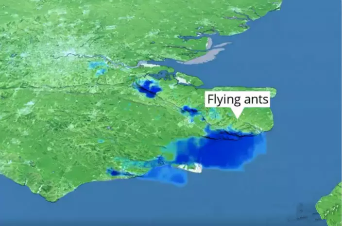 英國氣象局上周五(17日)在Twitter上發文,表示氣象雷達偵測到倫敦、肯特郡(Kent)或薩塞克斯郡(Sussex),但衛星圖像顯示當地的雲層不足,專家懷疑是類似雨型大小的昆蟲,而網民其後在社交媒體標籤「Flyingants」,透露成群飛蟻在空中盤旋近2小時,綿延約80公里,這才確定原來雷達檢測到的是飛蟻。
