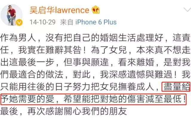 和石洋子於2008年誕下吳熙兒,兩人於14年離婚,當時囡囡5歲,石洋子亦放棄撫養權。吳啟華擔心離婚會影響到囡囡,亦曾公開表示:「儘量給予她需要的愛,希望能把對她的傷害減至最低。」