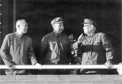 1976年10月6日,中央政治局執行人民的意志,毅然粉碎了「四人幫」反革命集團。在這一鬥爭中,華國鋒、葉劍英、李先念起了重要作用。圖為李先念(左)與華國鋒(中)、葉劍英在24日北京慶祝粉碎「四人幫」的群眾大會上