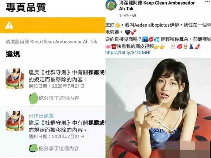 不過帖文似乎「玩大咗」,阿德今日再發文指,帖文已經被Facebook用「違反裸露或性行為規定」移除,變成真「滅蚊」,「係咪有人Report我啊?張相只係我為咗出 Post上網買嘅一張模特兒相,而模特兒係著住泳衣㗎,點解會係『裸露及色情』呀?冤枉啊,我都係想提大家要預防蚊患啫!」