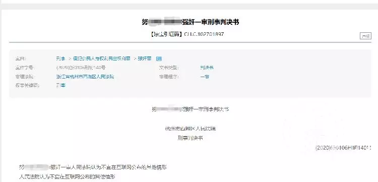 上游新聞記者查找裁判文書網發現,今年4月17日,浙江省杭州市西湖區人民法院作出(2020)浙0106刑初140號刑事判決後,案件詳情未予以公佈,「因人民法院認為有不宜在互聯網公開的其他情形」。