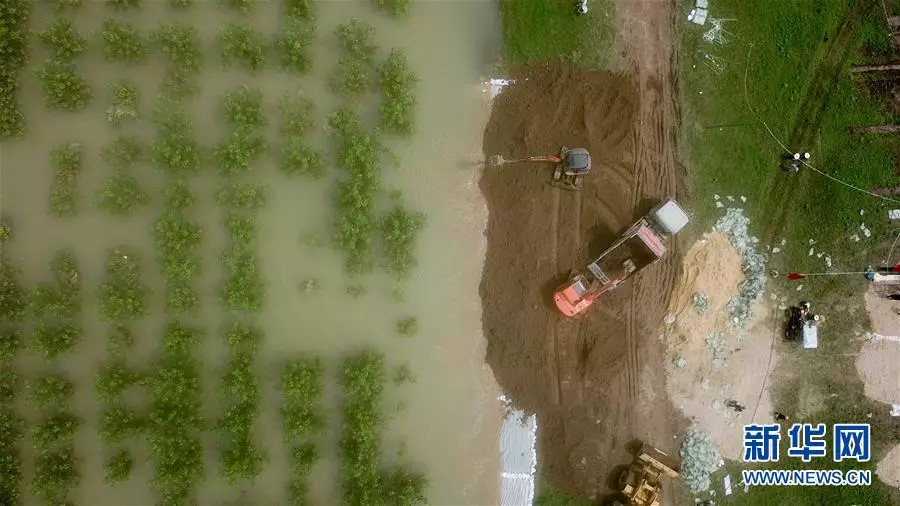 7月20日,在永固垸西線防洪大堤,工作人員處置滲漏險情(無人機照片)。新華社記者 陳澤國 攝