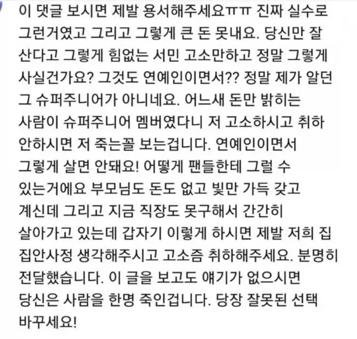 被起訴的惡評者在Instagram留言道:「看到留言拜託原諒我吧!因為失誤了才會說出那樣的話,我也沒有錢可以賠給你。只有你活得那麼好,卻起訴無任何反擊能力的普通市民,更何況你是藝人!如果你不取消起訴的話,你就會看著我死。為什麼可以對一個父母也沒有錢、現在還找不到工作、艱難地活著的人這樣?看到我家庭狀況請你取消起訴吧!我已經說得很清楚,如果你還不取消起訴就是殺人兇手,請你改變你錯誤的選擇!」