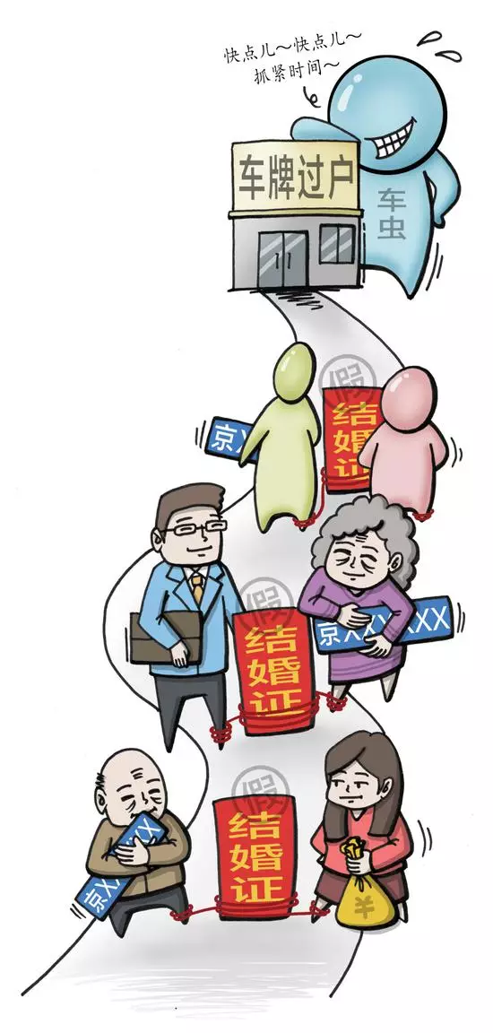 辦理結婚過戶業務的車蟲將標主與買號者根據年齡和戶籍地進行配標,奔波於北京周邊地區辦理結婚證,而後網上預約過戶時間。車蟲蠢蠢欲動之外,預約系統無法佔號、加大檢查力度等方式也在逐漸堵住假借結婚變更過戶的行為。