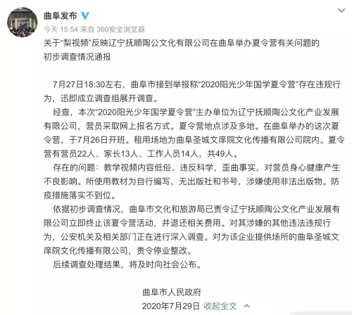 29日下午,@曲阜發佈 發出情況通報:責令相關公司立即終止該夏令營活動,並退還相關費用。對為該企業提供場所的曲阜聖城文庠院文化傳播有限公司,責令停業整改。