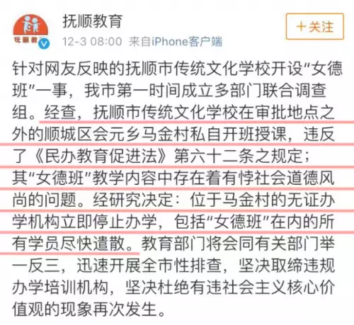 2017年,遼寧撫順「女德班」事件引髮網友的強烈關注。最終,當地教育部門出面要求有關機構立即關停「女德班」,並遣散學員。