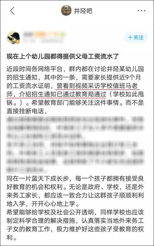 日前,河北石家莊市井陘縣一幼兒園在招生公告中要求家長提供工資明細流水的事件在當地的微信朋友圈中引發了爭議。所屬教育局回應新京報《緊急呼叫》稱,此舉是幼兒園方面為了核實家長身份,暫時不會介入進行調整。