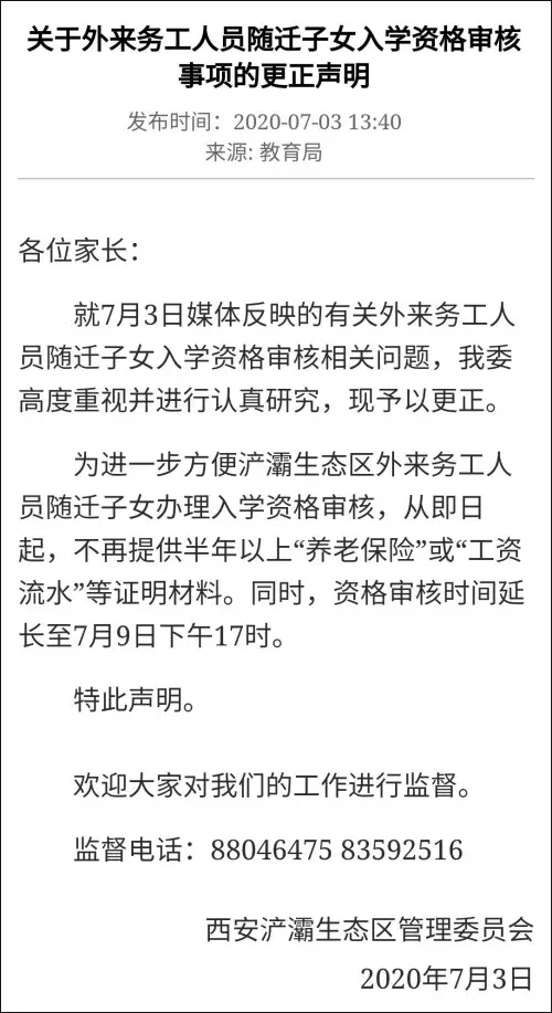 周知後,西安市滻灞生態區管委會7月3日表示,即日起,外來務工子女入學不需要提供半年以上社保或工資流水證明。