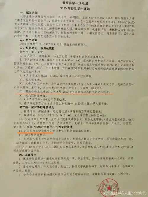 7月28日,有網友在百度貼吧「井陘吧」上曬出該縣第一幼兒園2020年新生招生通知。