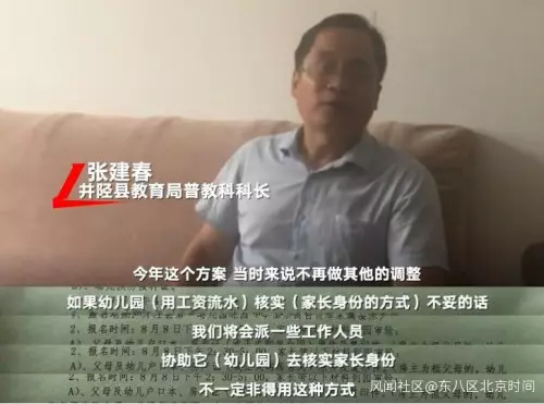30日下午,井陘縣教育局普教科科長張建春在接受新京報《緊急呼叫》的採訪時表示,暫時不會對上述文件作出調整,「如果幼兒園(用工資流水)核實(家長身份的方式)不妥的話,我們會派出一些工作人員協助它去核實家長身份,不一定非得用這種方式。」