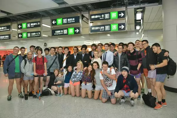 香港今年第二年響應「無褲日」乘港鐵活動,有近40人出席,當中不少是外籍青年男女。他們在中環港鐵站上車後分為5組活動,雖然只著內褲,仍表現得旁若無人。