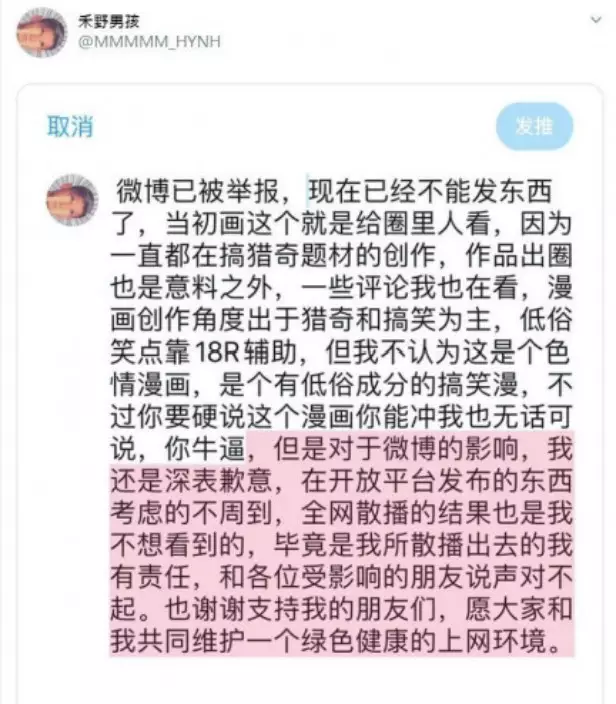 禾野男孩表示,對於作品發佈在微博上所造成的影響,他深表歉意,在開放平台發布作品考慮不周,瘋傳的結果也是他不想看到的,但作品畢竟是他散播出去的,所以他也有責任,向各位受到影響的朋友說聲對不起,也感謝支持他的朋友,「願大家和我共同維護一個綠色健康的上網環境」。