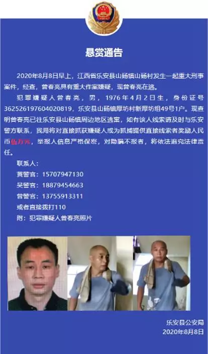 此前報道,8月8日,江西樂安縣發生一宗重大刑事案件,犯罪嫌疑人曾春亮潛入康女士家中,拿錘子對其母親和熟睡中的父親行兇,致父母當場死亡。事主表示,該兇殺案發17天前,他們已經至少兩次報警,但仍未能阻止悲劇發生。兇手至今在逃。