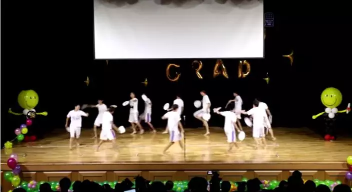 本身12名男生穿着白色T恤兼白色四腳褲進場,但觀眾打招呼後,便在台上開始脫去衣服及褲子,引起一陣尖叫;其後他們又向台下揮手,一名穿着畢業袍的學生立即上台,並一同脫去衣服,加入他們的行列,一起跳舞,全程利用白扇遮住重要部位。