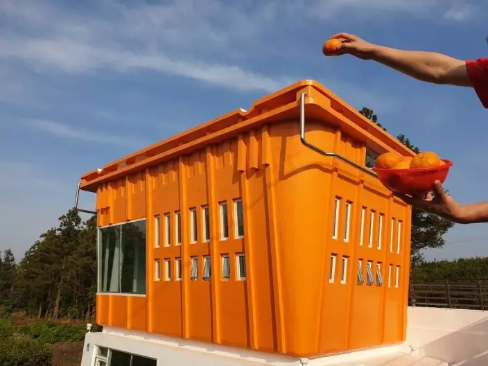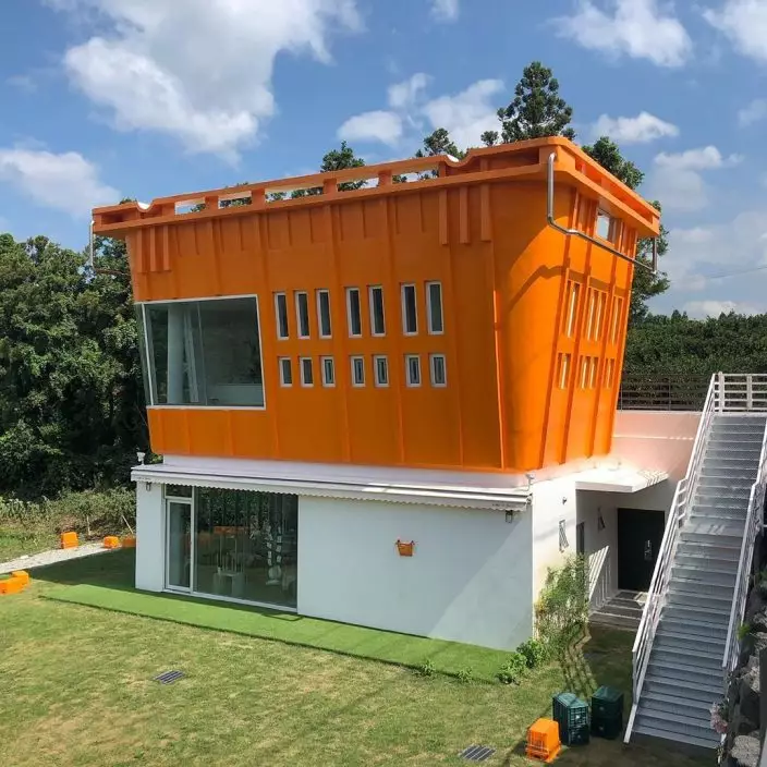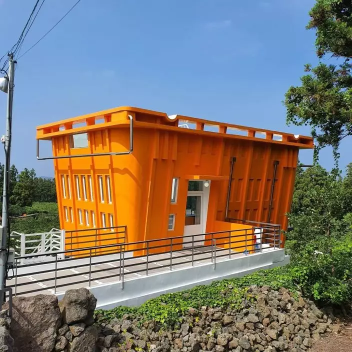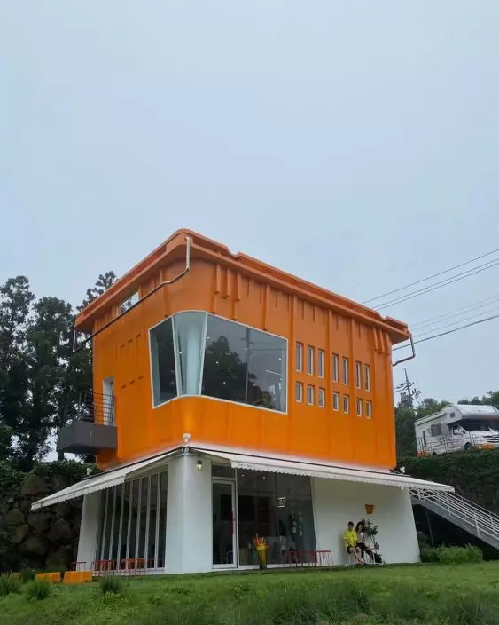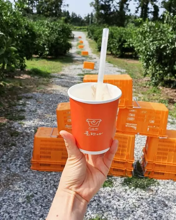 在濟州島許多地方都有售賣與柑橘相關的產品和食物,當中在朝天小瑞士村附近就有一家以柑橘做主題的CAFE,不止有柑橘味的餐點供應,還因為其極有趣超巨大橙色提籃的建築外形,無論裡裡外外都成為打卡熱點。