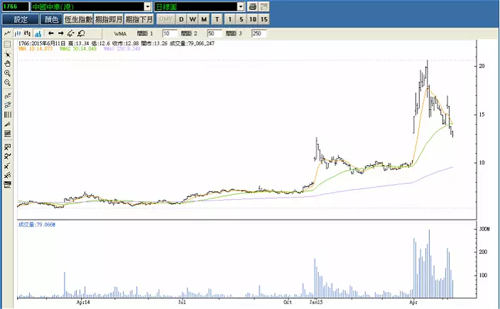 而中車(1766)就係其中的弱股,從高位20.65元,跌到低位11元,昨收11.7元,跌了43%,之前的升幅消耗了大部分,跌幅遠大過大市。