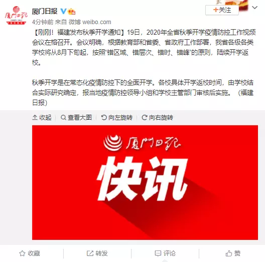 秋季開學是在常態化疫情防控下的全面開學。各校具體開學返校時間,由學校結合實際研究確定,報當地疫情防控領導小組和學校主管部門審核後實施。(福建日報)