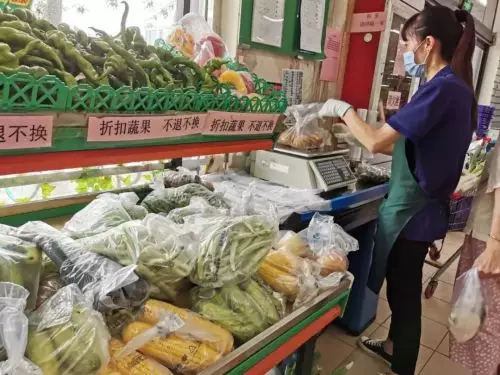 在永輝超市六里橋店,水果區稱量處旁放有一個盒子,盒內水果表面有些毀損,原價11.98元/千克的黃桃,打折後只賣7.98元/千克;原價9.98元/千克的木瓜,打折後賣4元/千克。和平門菜市場也有不少隔日蔬菜或是賣相不好的水果在降價銷售。店內稱重處左側放著一堆處理蔬果,黃瓜、青椒、鮮食玉米及豇豆、毛豆等食材,上面標籤顯示「折扣蔬果 不退不換」。市場內,番茄櫃枱旁擺著一個綠色塑料筐,筐內幾袋兒番茄也綁著“果蔬處理”的標籤,每袋價格一元多錢,“按正常價兒買,一袋怎麼也八九元。”一位老人選了袋番茄,她說自己曾多次買打折水果。“這些便宜,也沒毛病。其中不少是顧客挑選後又不要的,再破袋也麻煩,所以就處理了。”一售貨員介紹。