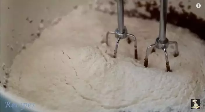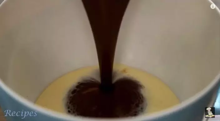 將兩碗混合物倒在一起攪拌,再逐少加進麵粉,同樣時用打蛋器攪拌至完全融合。